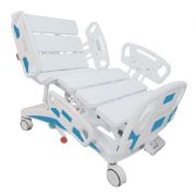 Descrição: Construída em aço carbono, com tratamento antiferruginoso e acabamento em pintura eletrostática a pó epóxi, com rodízios blindados, maciços e decorativos de 6”. Sistema de Freios dotado de pedal central com três movimentos, sendo totalmente travado, livre e direcional. Cabeceira, peseira, grades, leito e carenagem em polietileno injetado ABS de alta resistência. Grades protegem sem restringir os movimentos do leito, dotados de sistema mecânico, a mesma acopla-se abaixo do leito proporcionando assim maior facilidade ao descer da cama. Movimento das articulações através motor elétrico bivolt. Importado de tecnologia alemã, com controle por membranas nas grades e na peseira da cama, com controle de permissões para o paciente efetuar os movimentos, fowler, semi-fowler, flexão de pernas, sentado, cardíaco, elevação do leito, trendelemburg e reverso do trendelemburg (proclive)