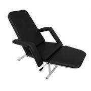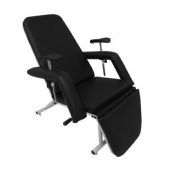 Poltrona para coleta de sangue: poltrona estofada reclinável construída em tubos redondos de aço carbono, com tratamento antiferruginoso e acabamento em pintura eletrostática a pó epóxi. Com braçadeira dos dois lados para apoio dos braços, ambos removíveis, com altura regulável e estofados com revestimento em courvim. Movimentos de costas e pés reclináveis separadamente em 5 posições através de sistema mecânico. Assento, encosto e pés estofados com espuma D28 de 10 cm com acabamento em courvim de fácil higienização. Pés com ponteiras plásticas.